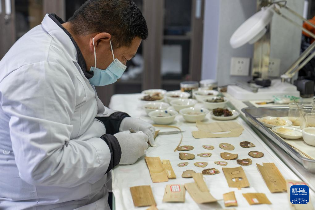 布达拉宫贝叶经实验性修复小组实验室工作人员对贝叶进行处理(5月25日摄)。新华社记者 旦增尼玛曲珠 摄