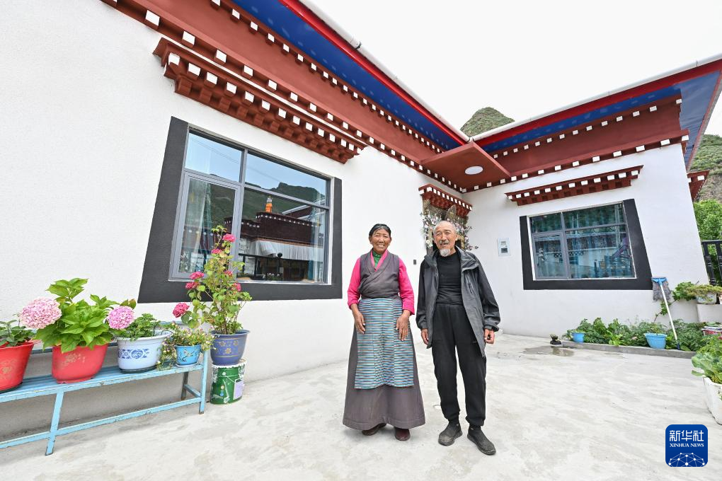 7月21日,拉丁雪村74岁的扎西欧珠(右)和73岁的老伴索朗玉珍站在自家的新房前合影。新华社记者 晋美多吉 摄