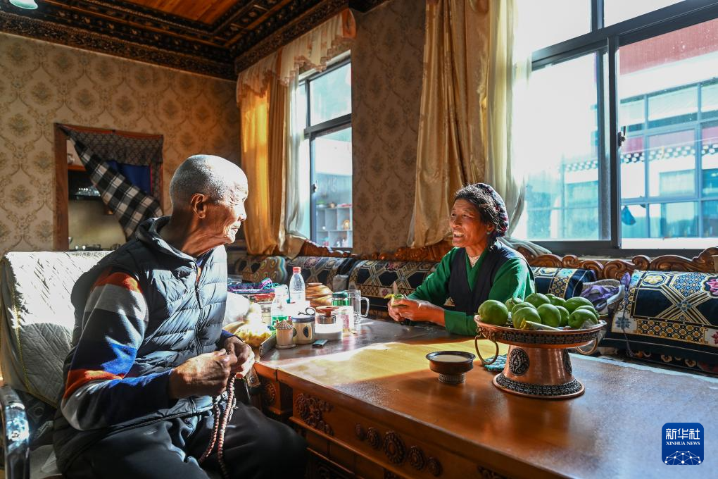 7月21日,58岁的拉丁雪村妇联主席格桑德青(右)在自家改造提升后的餐厅里给88岁的父亲乔多吉削水果。新华社记者 李鑫 摄