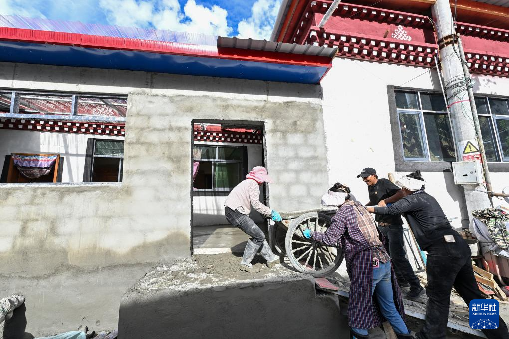 7月21日,51岁的拉丁雪村村民次旺罗布(右二)在村民的帮助下运输建筑材料,改造提升自己的房屋。新华社记者 李鑫 摄