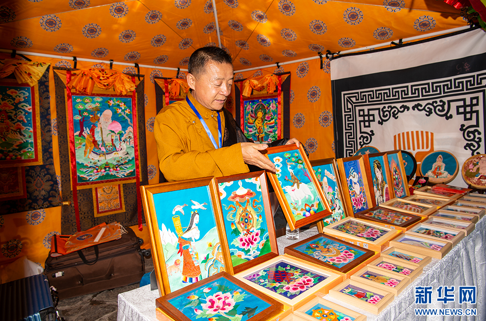 7月26日,来自青海的热贡艺术(堆绣)代表性传承人夏吾当周在介绍特色文创产品。新华网 旦增努布 摄