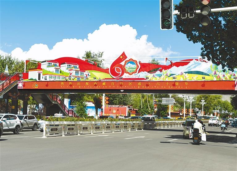 今年是西藏自治区成立60周年,漫步在拉萨街头,主城区的人行天桥焕然一新,路灯灯杆上主题灯箱与中国结相得益彰,处处洋溢着喜庆祥和的迎大庆氛围。