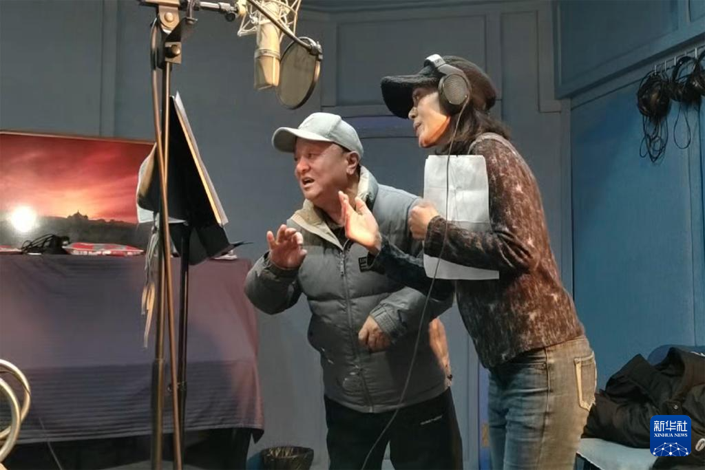 美朗多吉(左)在录音室中指导歌手演唱(视频截图)。新华社发