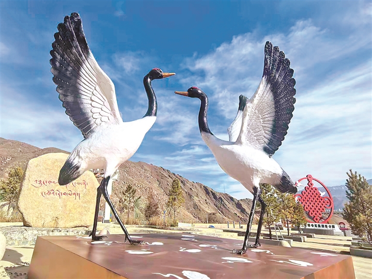 图为哲蚌寺民族团结主题公园内的拉萨市鸟黑颈鹤雕塑。记者 卢文静 摄