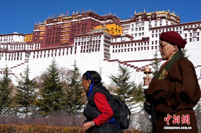 1月23日,西藏拉萨布达拉宫脚下,信众手持转经筒转经。冬季高原进入农闲期,众多藏传佛教信众从各地来到拉萨,沿布达拉宫、大昭寺等地转经、朝拜、祈福。中新社记者 李林 摄