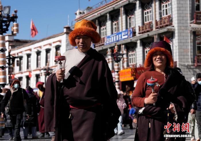 1月23日,西藏拉萨八廓街,信众手持转经筒转经。冬季高原进入农闲期,众多藏传佛教信众从各地来到拉萨,沿布达拉宫、大昭寺等地转经、朝拜、祈福。中新社记者 李林 摄