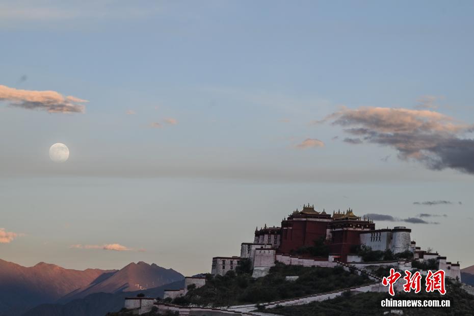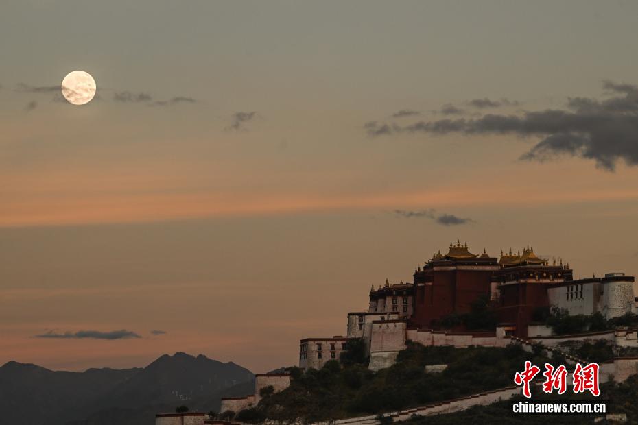 10月6日中秋节,西藏拉萨,布达拉宫与圆月同框。中新社记者 贡嘎来松 摄