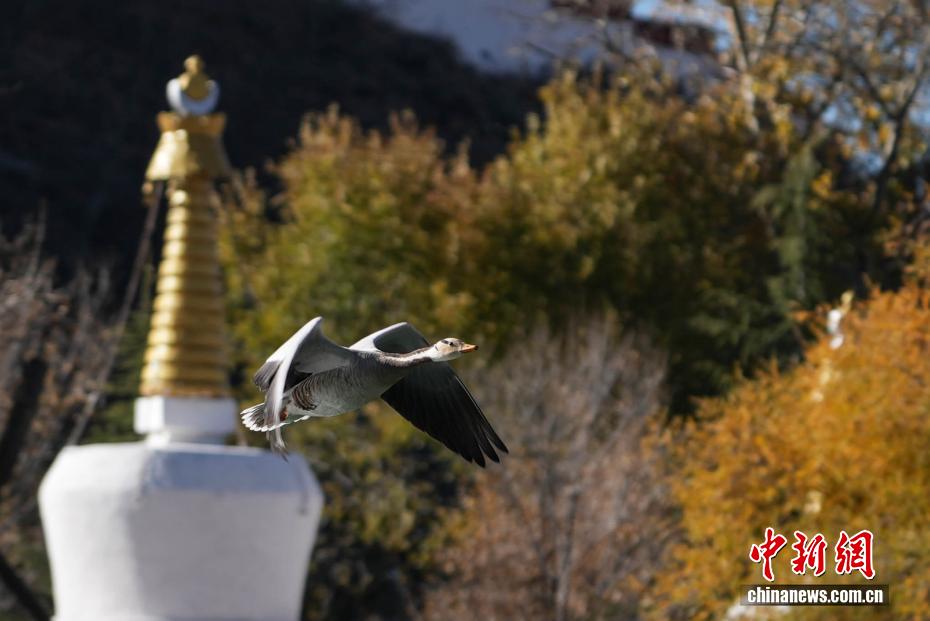 11月17日,西藏拉萨迎来大批越冬候鸟。拉萨河、宗角禄康公园等地,成为了它们的栖息天堂。在宗角禄康公园内,赤麻鸭、斑头雁成群结队,时而低头觅食,时而水中嬉戏。它们的身影引得市民和游客纷纷驻足观赏、拍照留念,构成了一幅人与自然和谐共生的美丽画卷。图为斑头雁从宗角禄康公园上方飞过。贡确 摄