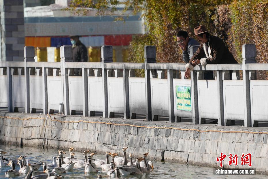 11月17日,西藏拉萨迎来大批越冬候鸟。拉萨河、宗角禄康公园等地,成为了它们的栖息天堂。在宗角禄康公园内,赤麻鸭、斑头雁成群结队,时而低头觅食,时而水中嬉戏。它们的身影引得市民和游客纷纷驻足观赏、拍照留念,构成了一幅人与自然和谐共生的美丽画卷。图为市民在宗角禄康公园内投喂候鸟。贡确 摄