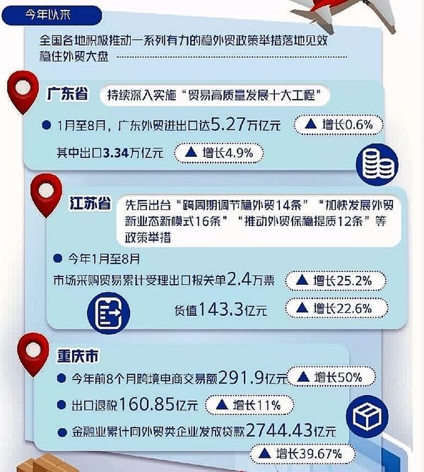 跨境电商等新业态也成为稳外贸的重要力量。今年,重庆成功举办了跨境电商交易会,积极推动跨境电商“保税进口+零售分装”业务试点,推广“跨境电商+产业带”模式,为外贸企业稳订单、拓市场提供了新的解决方案。今年前8个月,重庆跨境电商交易额达291.9亿元,增长50%。