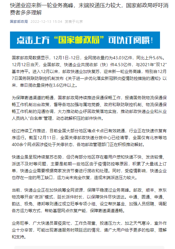 据“国家邮政局”公众号13日消息,当前,快递企业正在加快统筹全网资源,保障平稳渡过业务高峰。邮政、顺丰、京东物流等开启“夜派”模式,延长派件时长,以保障快件尽快送达。中通、圆通、申通、韵达、极兔、德邦等则通过成立旺季专项小组、设立帮扶基金、加强人员招聘、调配各方运力等方式,帮助基层网点恢复产能,保障寄递渠道通畅。(中新财经)