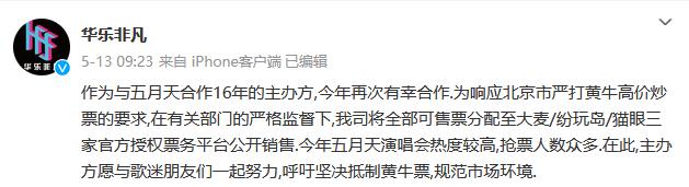 5月13日,华乐非凡在官方微博发布声明,五月天演唱会全部可售票是在有关部门的严格监督下,分配至官方授权票务平台公开销售。然而对于这则声明粉丝们并不买账,评论区里有粉丝询问“不可售”的票去哪儿了?