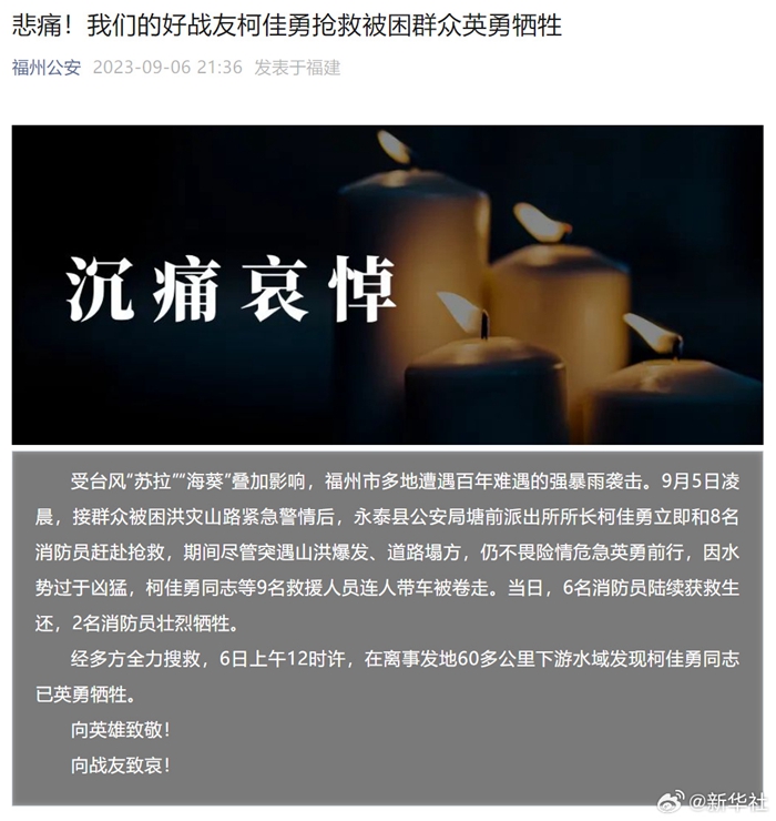 受台风“苏拉”“海葵”叠加影响,福州市多地遭遇百年难遇的强暴雨袭击。9月5日凌晨,接群众被困洪灾山路紧急警情后,永泰县公安局塘前派出所所长柯佳勇立即和8名消防员赶赴抢救,期间尽管突遇山洪暴发、道路塌方,仍不畏险情危急英勇前行,因水势过于凶猛,柯佳勇同志等9名救援人员连人带车被卷走。当日,6名消防员陆续获救生还,2名消防员壮烈牺牲。经多方全力搜救,6日上午12时许,在离事发地60多公里下游水域发现柯佳勇同志已英勇牺牲。(记者:王成 来源:福州公安)