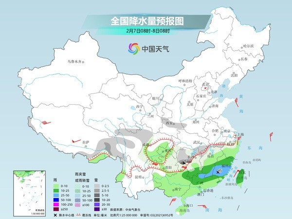 今天(2月7日)南方大范围雨雪天气持续,湖南中南部、江西西南部等地部分地区有大雪,局地暴雪;贵州中部和东部、湖南中南部以及江西西北部山区、浙江中南部山区等地部分地区有冻雨。明天,南方雨雪将开始减弱,到除夕全国大部地区都将迎来晴朗天气。同时,随着雨雪消退,持续多日的南方湿冷天气也将在春节假期间迎来转折。