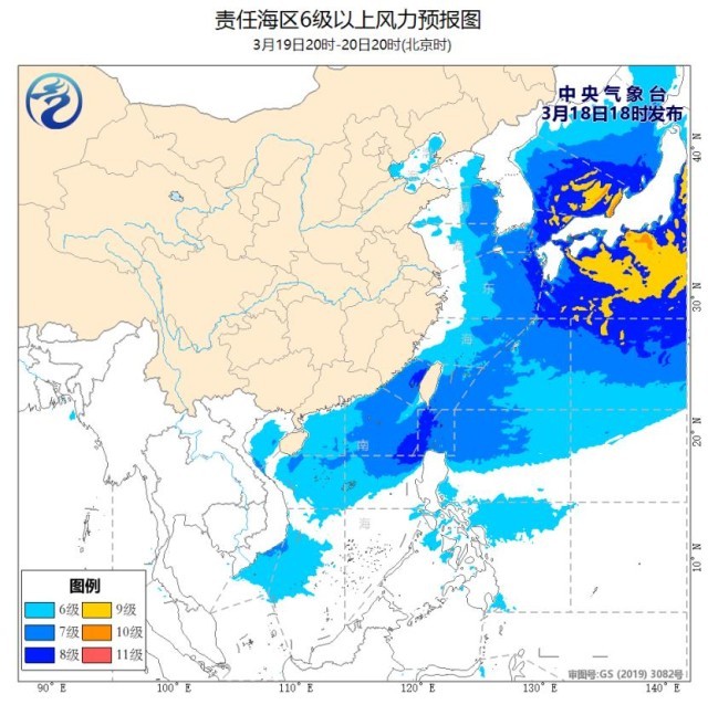 预计,19日白天至21日白天,东海南部海域、台湾海峡、台湾以东洋面、巴士海峡、南海大部海域、北部湾将有6~7级,阵风8级的偏北或东北风,其中台湾海峡、巴士海峡、南海东北部部分海域风力可达8级、阵风9-10级。