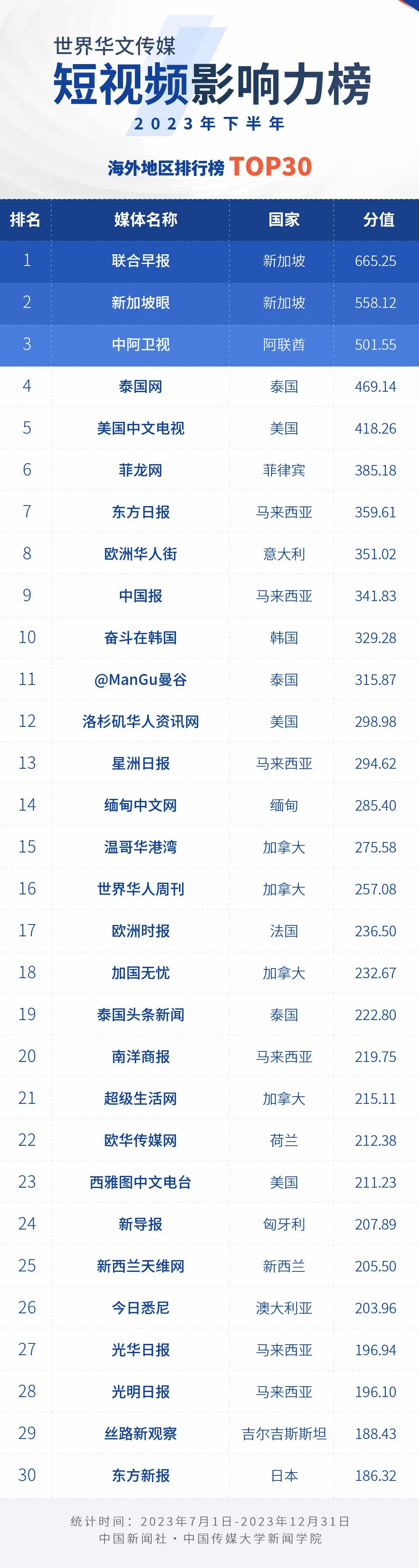 中国新闻社与中国传媒大学新闻学院持续开展“世界华文传媒新媒体影响力”测评项目,现根据2023年下半年世界华文传媒新媒体的业务数据,发布2023年下半年榜。