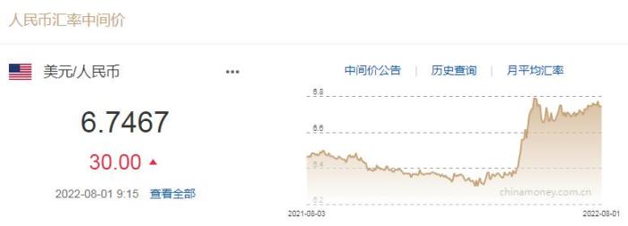 8月1日人民币对美元中间价报6.7467元 下调30个基点