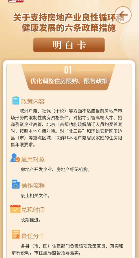 中新网8月9日电 据河北省廊坊市人民政府消息,廊坊市日前公布的《关于支持房地产业良性循环和健康发展的六条措施》明白卡显示,取消户籍、社保(个税)等不适应当前房地产市场形势的限制性购房条件。同时对“北三县”和环雄安新区周边县(市)的住房限售年限要求也全面取消。