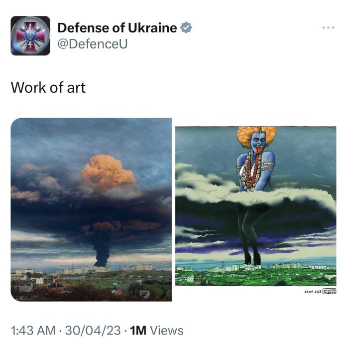 据俄新社、《印度斯坦时报》等多家媒体描述,乌国防部4月30日发布的这条推文中包含两张图片,第一张描绘了塞瓦斯托波尔湾一油库遭无人机袭击后升起的烟柱;另一张则是以第一张为基础创作的漫画,爆炸的浓烟中多了一名女性形象,她摆出与玛丽莲·梦露掩住裙摆相似的姿势,而这一女性形象本身又与印度教女神卡莉相似。乌克兰国防部对图片的描述是“艺术作品(work of art)”。