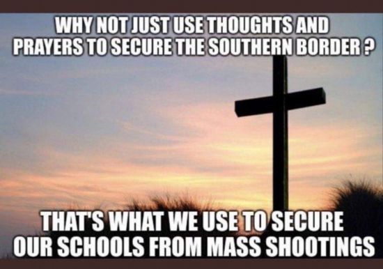 这幅漫画则讽刺说:“为什么我们不只靠祈祷来阻止非法移民进入美国?我们可是只靠祈祷来保护学校不发生大规模枪击。”
