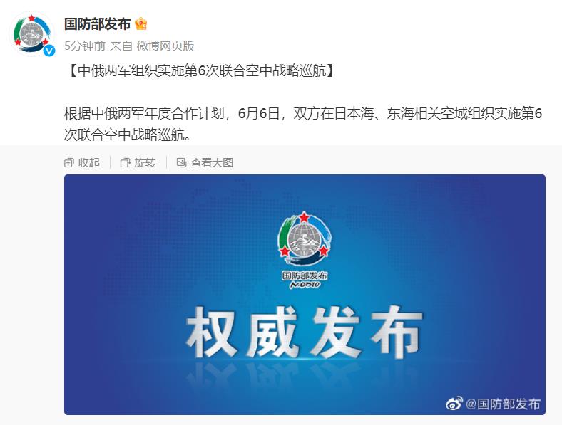 中新网6月6日电 据国防部新闻局官方微博消息,根据中俄两军年度合作计划,6月6日,双方在日本海、东海相关空域组织实施第6次联合空中战略巡航。