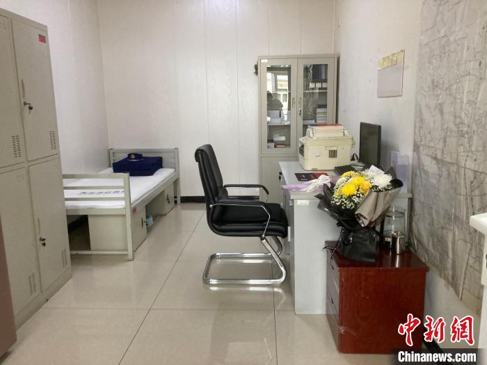 2023年8月,冯振在西小营小型站工作和生活的站长室,墙上贴着冯振和队员一起绘制的地图。 中新社记者 徐婧 摄