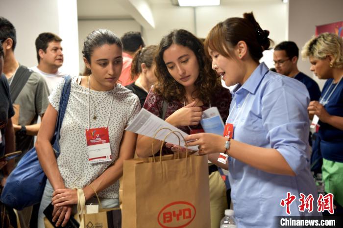 当地时间4月13日,巴西圣保罗,两位巴西应聘者在第六届巴西中资企业人才招聘会上向中国电动车企业了解岗位信息。中新社记者 林春茵 摄