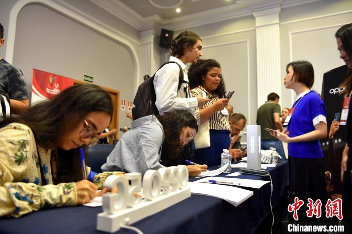 当地时间4月13日,巴西圣保罗,巴西应聘者们在第六届巴西中资企业人才招聘会上填写应聘信息。中新社记者 林春茵 摄