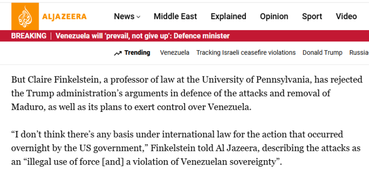 美国宾夕法尼亚大学法学教授克莱尔·芬克尔斯坦(Claire Finkelstein)在接受半岛电视台采访时,驳斥了特朗普政府为自身行动所作的辩护。“我认为美国政府采取的行动毫无国际法依据,”她直言,该袭击属于“非法使用武力及侵犯委内瑞拉主权”。芬克尔斯坦还就特朗普所谓让美国“统治”委内瑞拉的计划予以批驳,称相关言论“极其非法,国家主权不容侵犯,任何人都无权随意入侵和占领他国”。