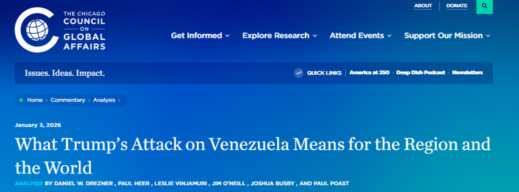 美国智库芝加哥全球事务委员会总裁兼首席执行官莱斯利·文贾穆里(Leslie Vinjamuri)发文称,若“贩毒、非法选举获胜或石油资源控制权”成为美国军事接管他国的新标准,那么2026年世界将迎来一段极为艰难的时期,步入前所未有的境地。这将对联合国体系、国家主权神圣不可侵犯这一重要理念,以及支撑现行国际秩序的更广泛国际规范与法律体系,造成深远而持久的冲击。
