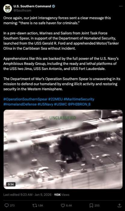 2026年1月9日,美国南方司令部确认,美军与美国国土安全部在一次联合行动中,在加勒比海控制并扣押“奥利娜”号油轮。