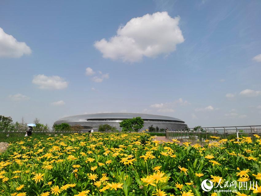 龙泉山脉绵亘远方,东安湖水荡漾眼底,体育场馆巍峨半空,花草树木各展春姿。在湖光山色之间,有大量市民前来踏青赏春,顺便欣赏着大运会场馆和火炬塔的风采。