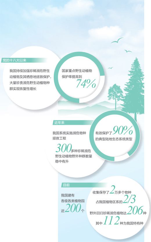 近年来,我国系统实施濒危物种拯救工程,采取就地保护、迁地保护、放归(回归)自然、人工繁育(培植)等措施,有效保护了90%的典型陆地生态系统类型,300多种珍稀濒危野生动植物野外种群数量稳中有升。目前,我国建有各级各类植物园近200个,收集保存了2万多个物种,占我国植物区系的2/3。野外回归珍稀濒危植物达到206种,其中112种为我国特有种。麋鹿、普氏野马曾一度在野外消失,目前通过人工繁育等方式,总数分别达近1万只和700只左右,并成功实施放归自然,重新建立了野外种群,生存区域和范围不断扩大。