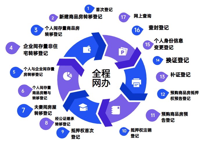 (17项常见登记业务的“全程网办”示意图,图源:北京市规划和自然资源委员会微信公众号,央广网发)