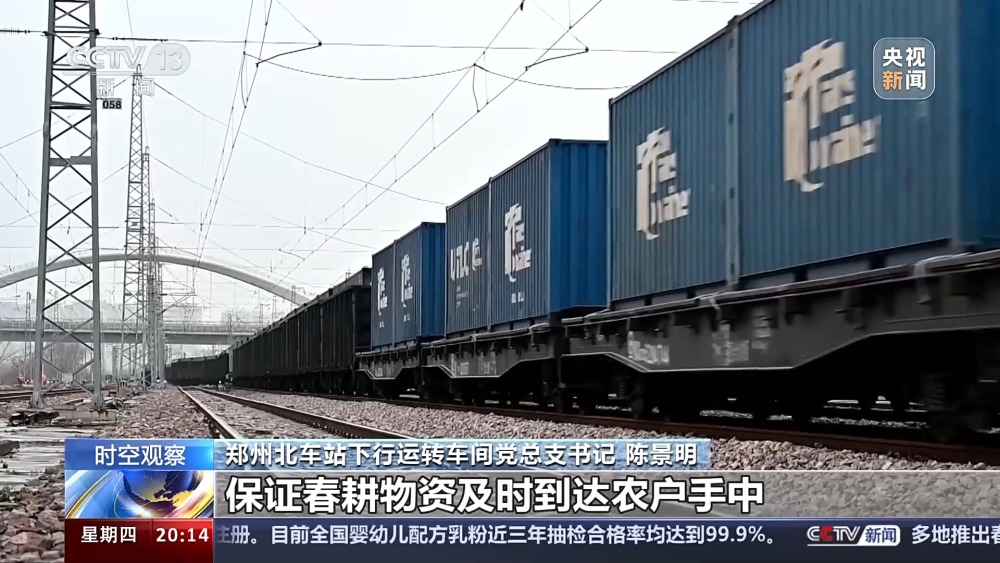 总台央视记者 蒋树林:这里是郑州北车站,也是全国作业量最大的编组站,大家看我眼前这个车里面装的就是当下春耕所急需用的化肥原料,作业还在加班加点地往前推进。