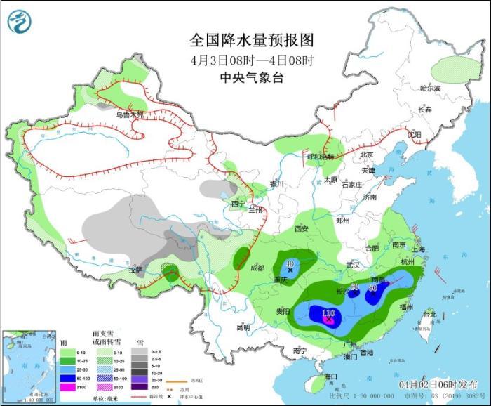 4月3日08时至4日08时,新疆北疆北部和伊犁河谷沿天山一带、西藏北部、青海东北部和南部、甘肃河西、川西高原北部、黑龙江东部等地部分地区有小到中雪或雨夹雪。江南中南部、西南地区东北部、华南北部等地部分地区有中到大雨,其中,湖南西南部、江西中部、广西东北部、广东西北部等地部分地区有暴雨或大暴雨(100~110毫米)。内蒙古河套地区和中部、新疆沿天山地区、西藏南部等地部分地区有4~5级风。