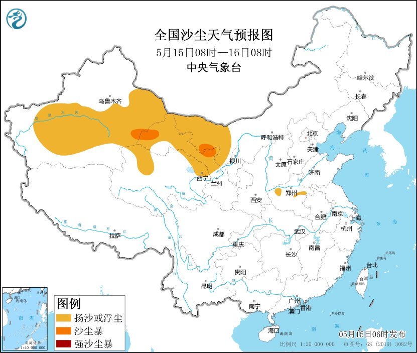 央视网消息:据中央气象台网站消息,预计,5月15日08时至16日08时,新疆南部和东部、甘肃西部、内蒙古西部、青海北部以及河南中部等地有扬沙或浮尘天气,其中新疆东部、甘肃西部、内蒙古西部等地局地有沙尘暴,中央气象台5月15日06时继续发布沙尘暴蓝色预警。