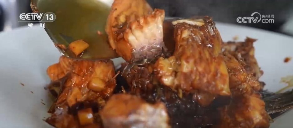 就在章阿占忙着捕鱼时,在荻港渔庄的后厨里,非遗传承人刘仲敏正娴熟地制作着“陈家菜”。获港陈家菜烹饪技艺是浙江省级非物质文化遗产,也是湖州著名“百鱼宴”的雏形。鱼身切块、下锅翻炒、酱汁浇淋,不一会儿,一盘香味扑鼻、当地人俗称的“大锅乌金子”就出锅了。