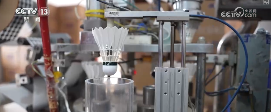 用原毛制作羽毛球,要经历40多道工序。从第一代人工脚踏冲床到第三代电脑控制冲床,日均切毛数量从15000片提升到了30000片。羽毛球包装出厂前的最后一步是飞行测试。投球机持续工作,迎面飞来的如果有摇摆球,就需要测试工人用特制的羽毛球拍果断地拍出去,以此确保每个出厂的羽毛球都具备良好的飞行稳定性。
