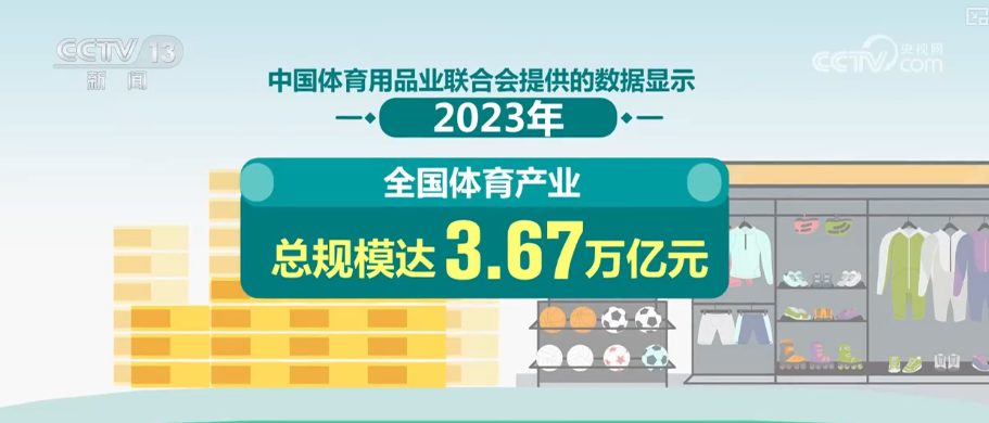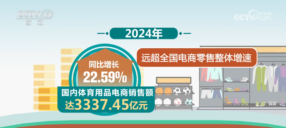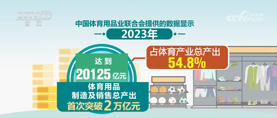中国体育用品业联合会提供的数据显示,2023年,全国体育产业总规模达3.67万亿元。其中,体育用品制造及销售总产出首次突破2万亿元,达到20125亿元,占体育产业总产出的54.8%。2024年,国内体育用品电商销售额达3337.45亿元,同比增长22.59%,远超全国电商零售整体增速。