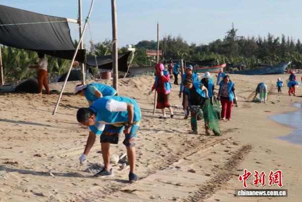 图为志愿者在三亚市梅联村进行常态化净滩工作。(三亚市生态环境局 供图)