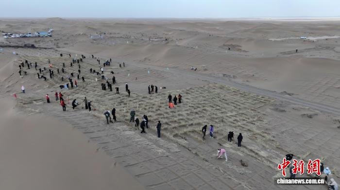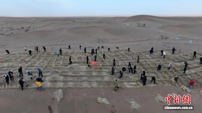 中新网兰州3月30日电 (戴文昌)30日,祁连山下春风渐暖,甘肃张掖市临泽县北部沙区内已是一派忙碌景象。当地治沙人迎着风沙、踏着春光,在广袤大漠上压沙植绿,用执着与坚守“拥抱”荒漠,一路向绿而行,在荒漠之上守护河西走廊生态安全屏障,让沙漠变绿洲。