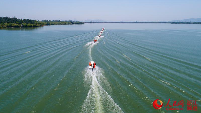 人民网湖州5月24日电 今天,湖州安吉天子岗水库水域一艘艘冲锋舟劈波斩浪、驰骋湖面,成为水面上一道道靓丽的风景线。