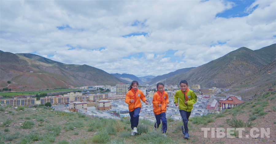图为昌都市洛隆县的小学生在学校的后山玩耍