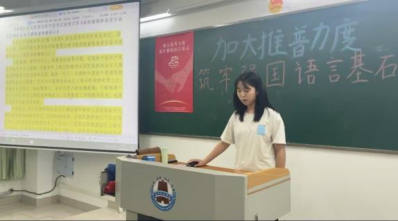 新学期伊始,《教师语言》课程教学团队将推普宣传与课程的“音韵筑基”内容相结合,理论层面讲解我国通用语言文字的相关法律政策和普通话声、韵、调等基础知识;实践层面指导学生利用中国语言文字数字博物馆、师圈小程序等课程资源进行学习,邀请学生介绍普通话的发展历程和我国第27届推普宣传主题中所渗透的“强国必须强语,强语助力强国”价值内涵。