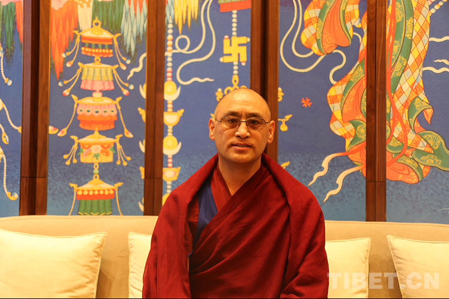 图为藏传佛教第十六届“拓然巴”高级学衔获得者、旺达寺民管会主任泽翁巴登接受记者采访 摄影:龙真多吉