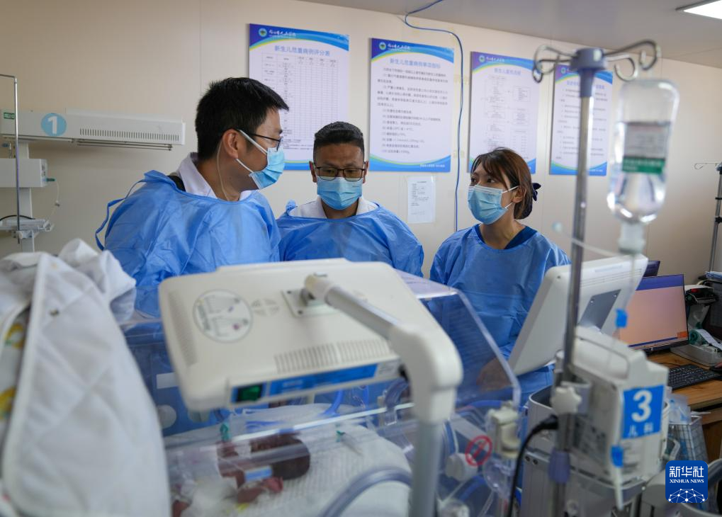 在那曲市人民医院新生儿重症监护室,来自大连医科大学附属第一医院的援藏医生田聪亮(左)与吉美多布杰(中)、护士旦珍合作,为一名早产儿实施机械通气治疗(7月18日摄)。吉美多布杰2003年从四川大学华西医学院毕业来到那曲市人民医院工作,他先后和8批援藏专家合作、学习。新华社记者 晋美多吉 摄