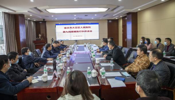 2月19日,大足区人民医院举行了重庆市第九批(大足区第二批次)援藏医疗队欢送会,5位医疗队员将踏上援藏之路,助力昌都市察雅县人民医院医疗水平的提高。大足区委常委、宣传部长蒋朝彬、大足区卫生健康委党委副书记杨徽建、大足区人民医院全体院领导以及相关科室负责人出席欢送仪式,院长助理谢惠主持仪式。