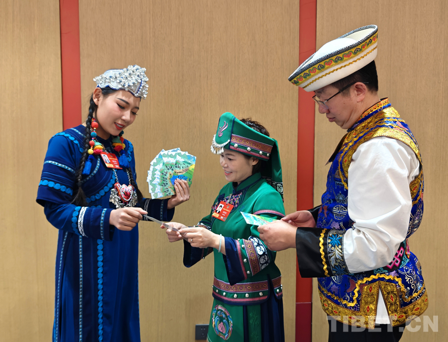 2026年全国两会期间,全国政协委员杨钰尼(左)为欧彦伶委员(中)、鄂崇荣委员介绍展示云南红河哈尼梯田的明信片。摄影:张萌萌