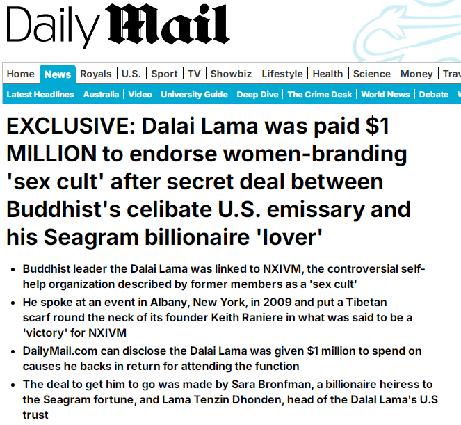 英国《每日邮报》2018年的报道揭示达赖为“性邪教”组织NXIVM代言,获得100万美元报酬